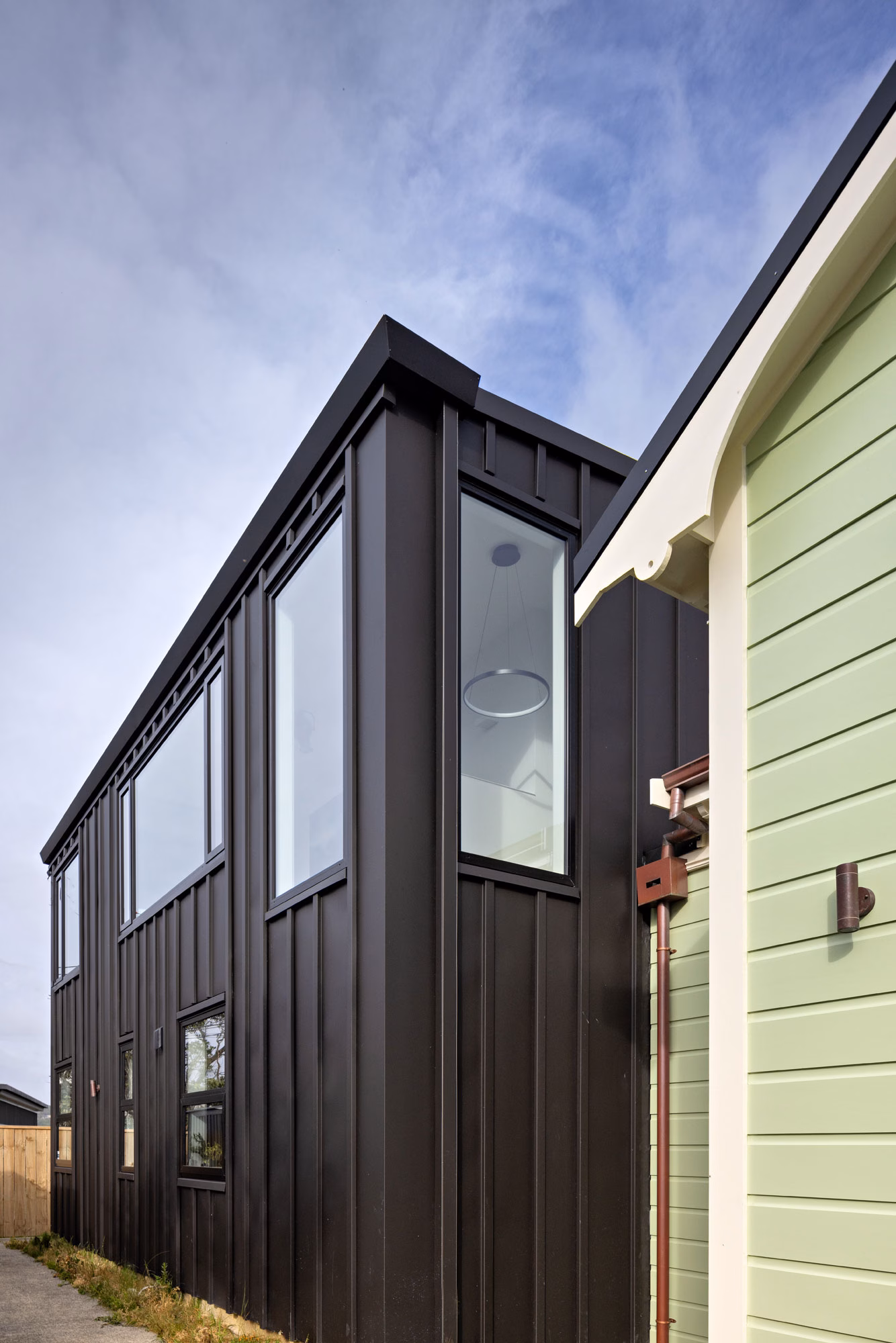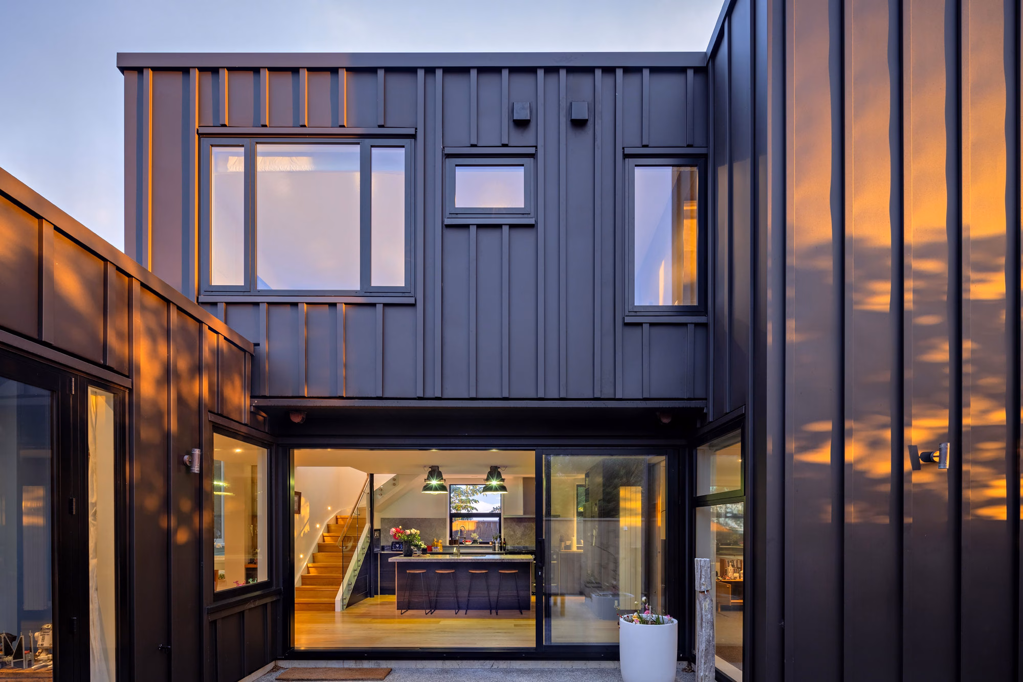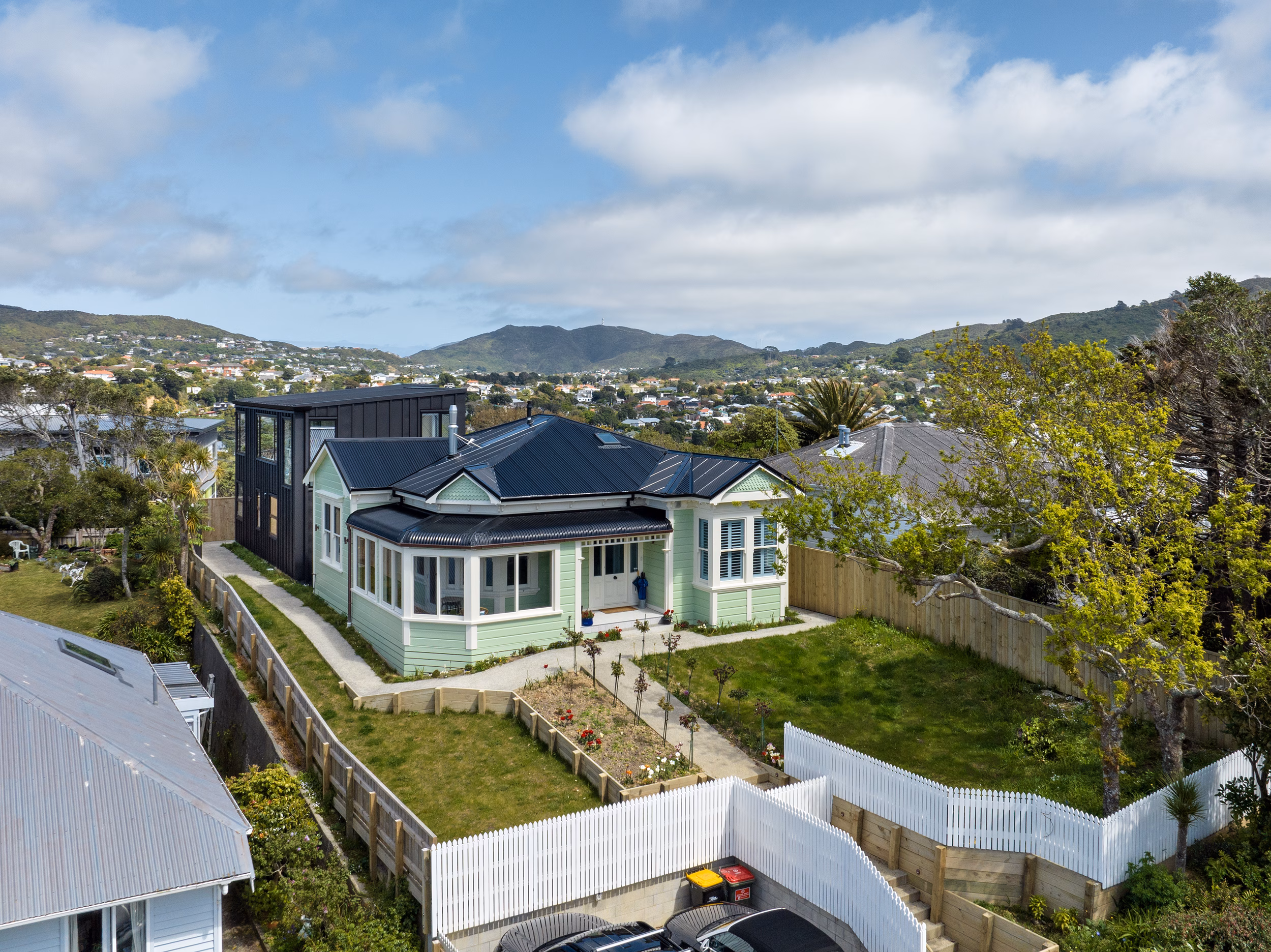 Interesting features like the new black pressed metal ceiling and unique light fittings instantly catch your eye on entering the house. Then there’s the original hallway arch that has been resurrected, resized and relocated to the adult lounge. This renovation covers all bases – family, artwork and amazing views that take in the harbour from Hutt Valley to the Heads.