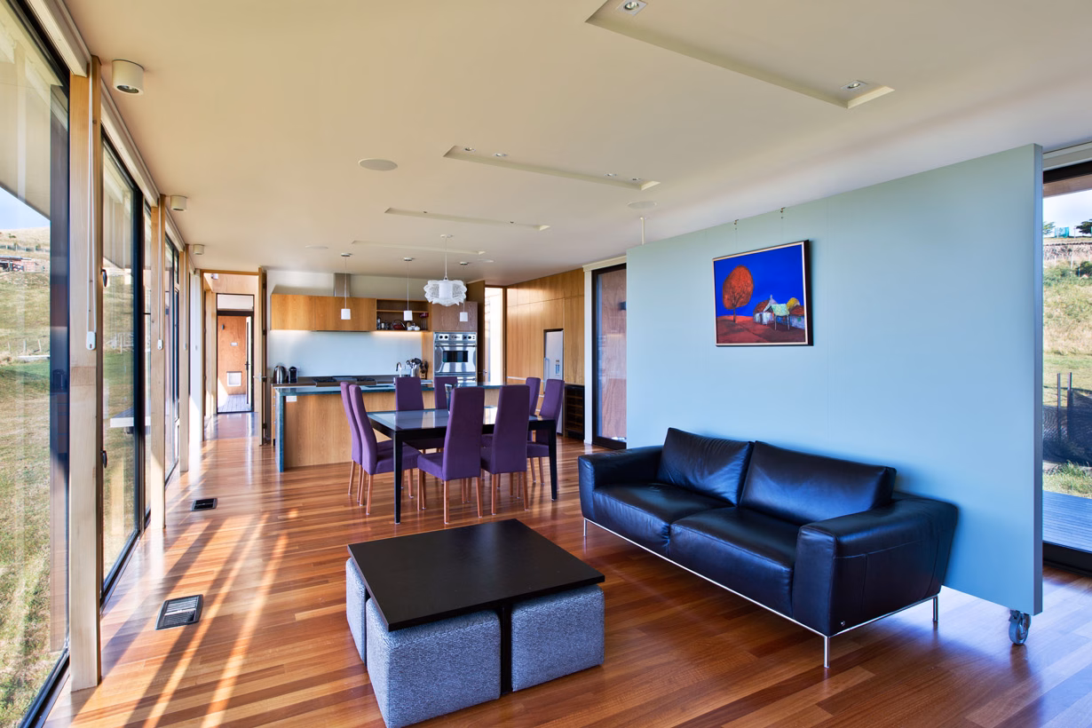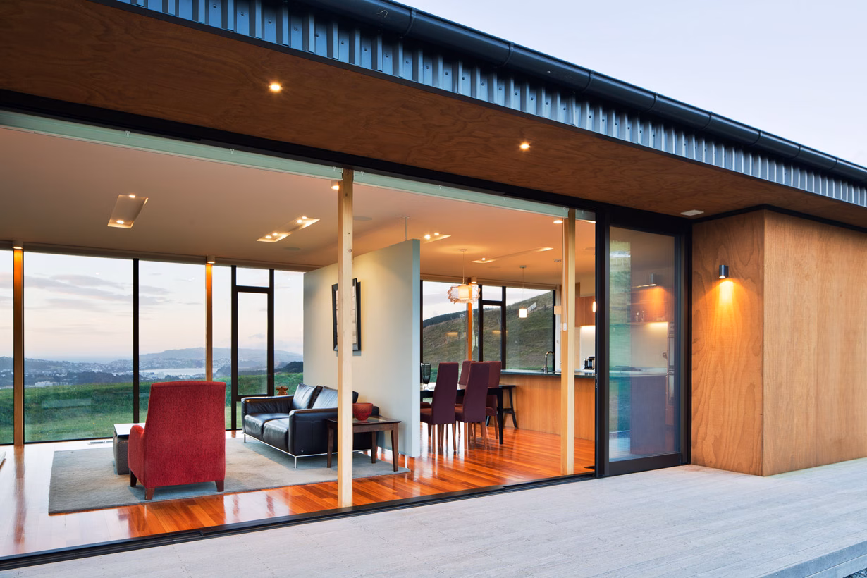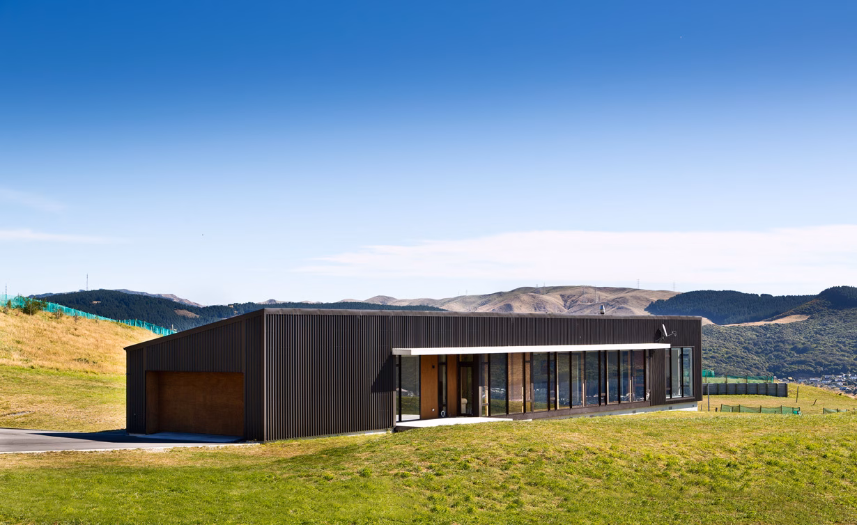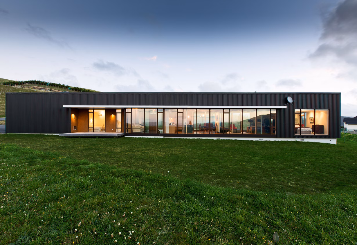 This Tennent Brown-designed home has been described as an elegant shed, stretching across a windswept hill with panoramic views.