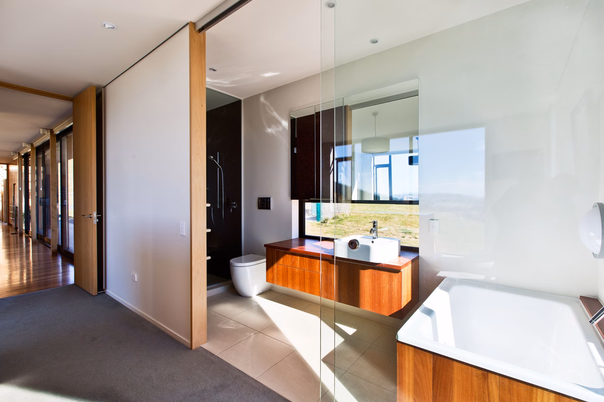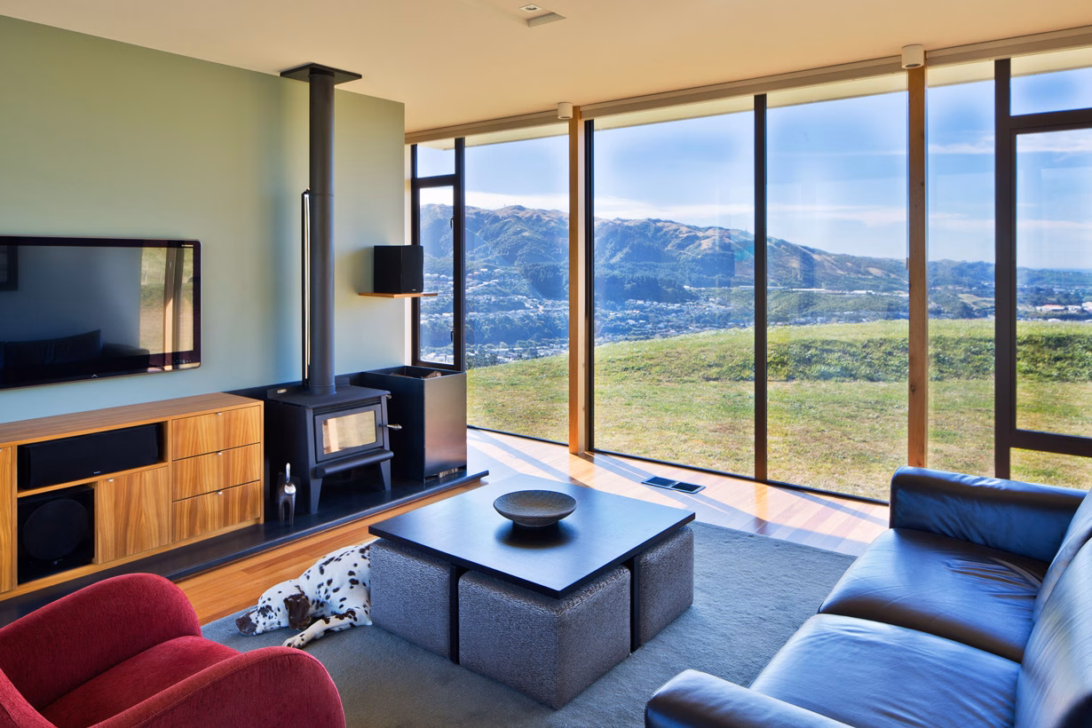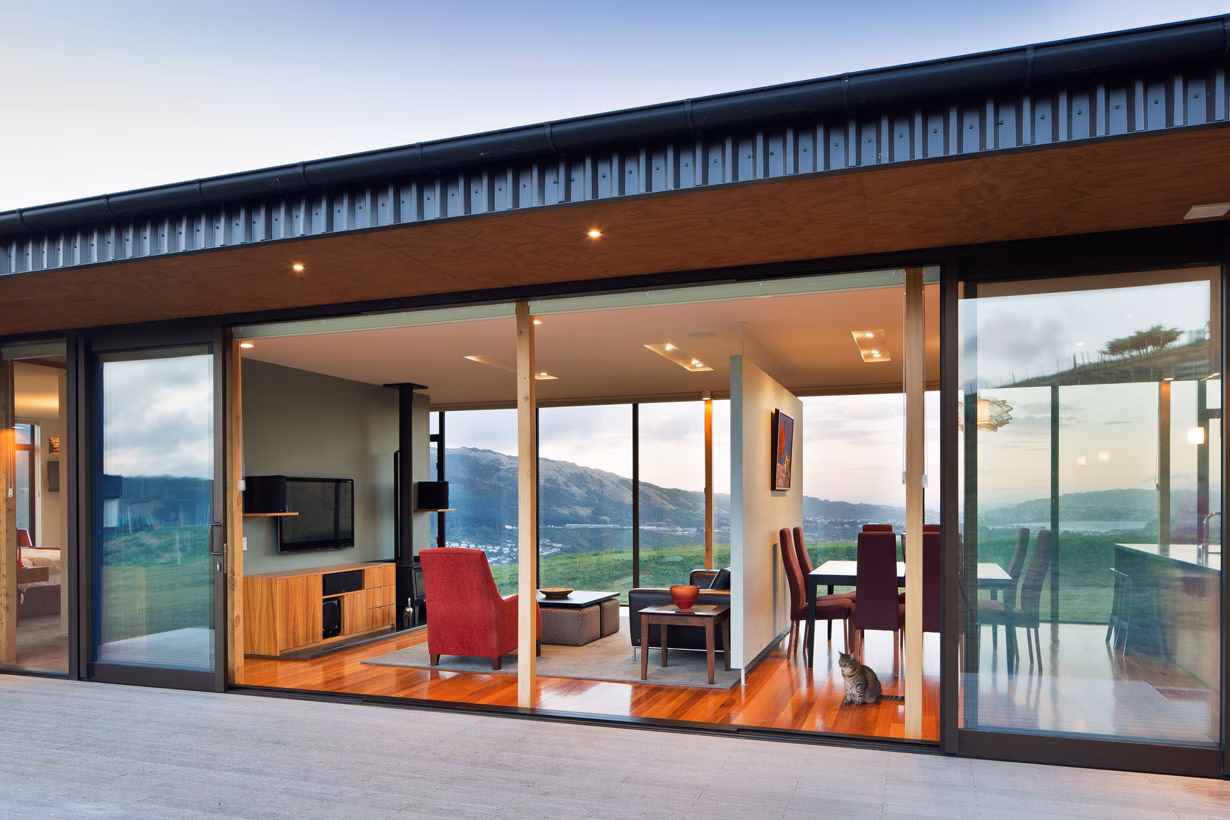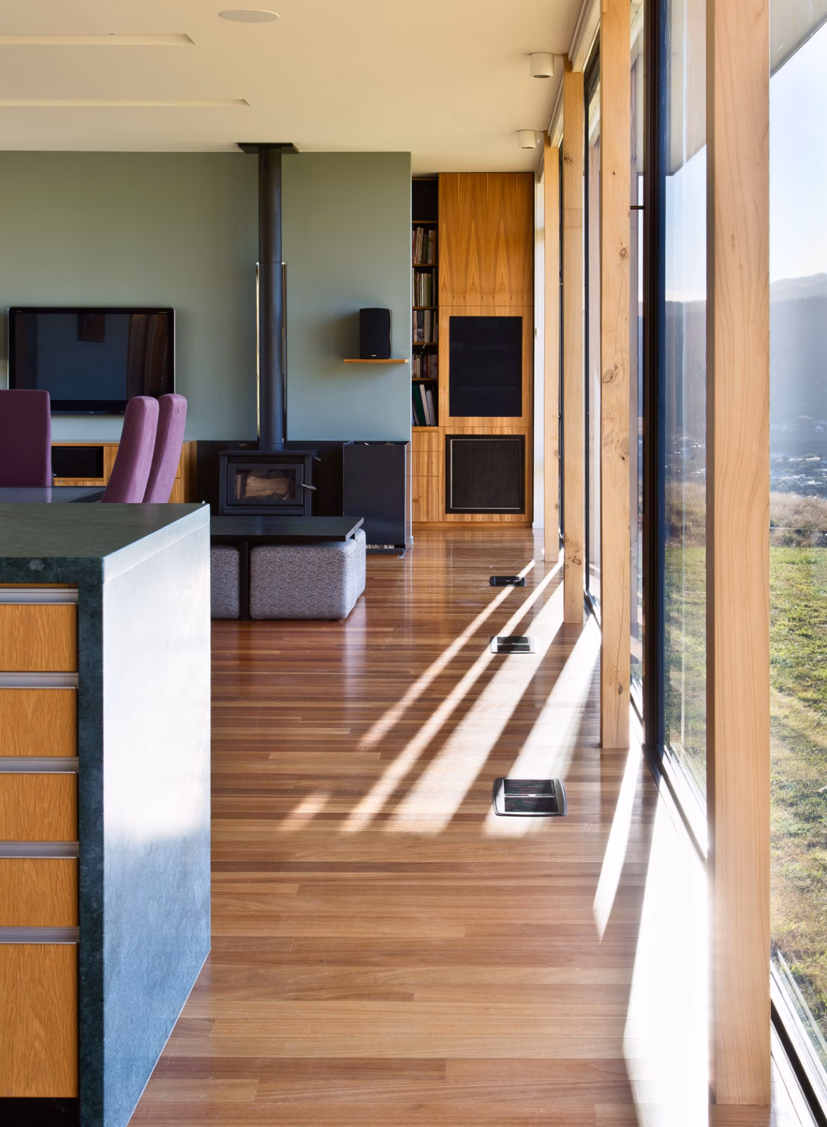This Tennent Brown-designed home has been described as an elegant shed, stretching across a windswept hill with panoramic views.