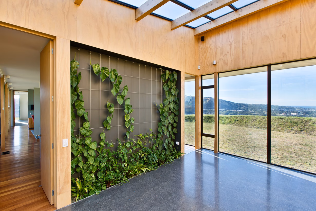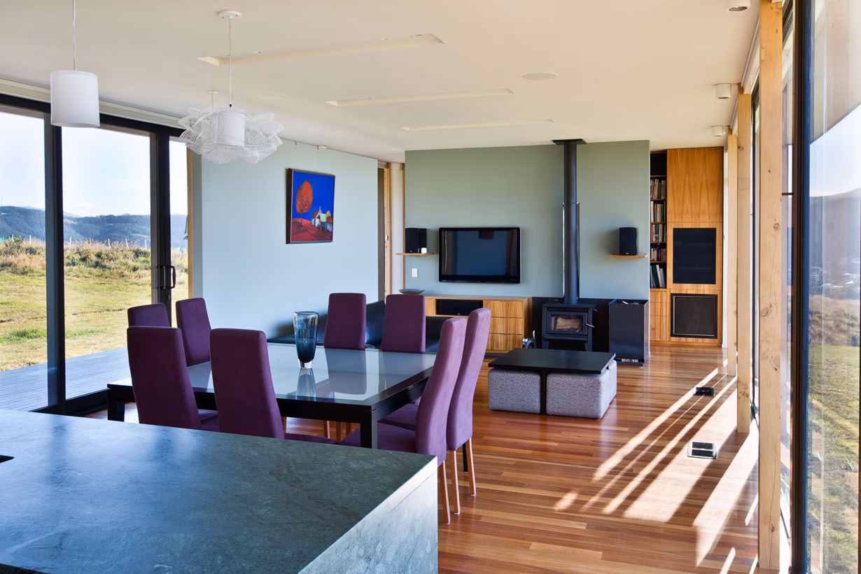 Designed to blend into its location, the stunning home features metal cladding, solar efficiencies, a central winter garden, and an adjustable dining/living room wall that caters for both the owner and any guests.